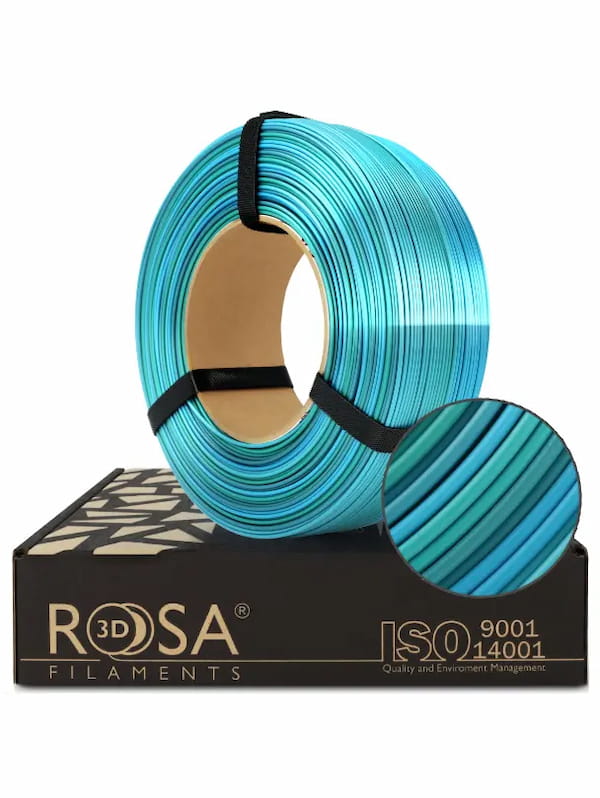 Filament 3D ReFill PLA Rainbow Silk Ocean od ROSA3D to prawdziwa perła wśród wielokolorowych materiałów do druku 3D. Inspirowany odcieniami oceanu – od błękitu i turkusu po granat, morską zieleń, stalowy i lazurowy – tworzy na wydrukach efekt głębi, światła i płynnego przejścia barw. To idealny wybór, jeśli chcesz, by Twój model wyróżniał się nie tylko kształtem, ale też wyjątkową estetyką.