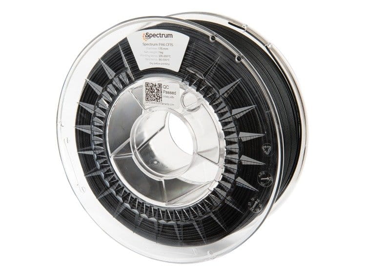 PA6 CF15 is 3D printer filament made of polyamide PA6 and carbon fiber. It represents Spectrum Industrial - a series of products which were prepared especially for variety of industrial applications. It is tough, very durable and temperature resistant 3D printer filament.